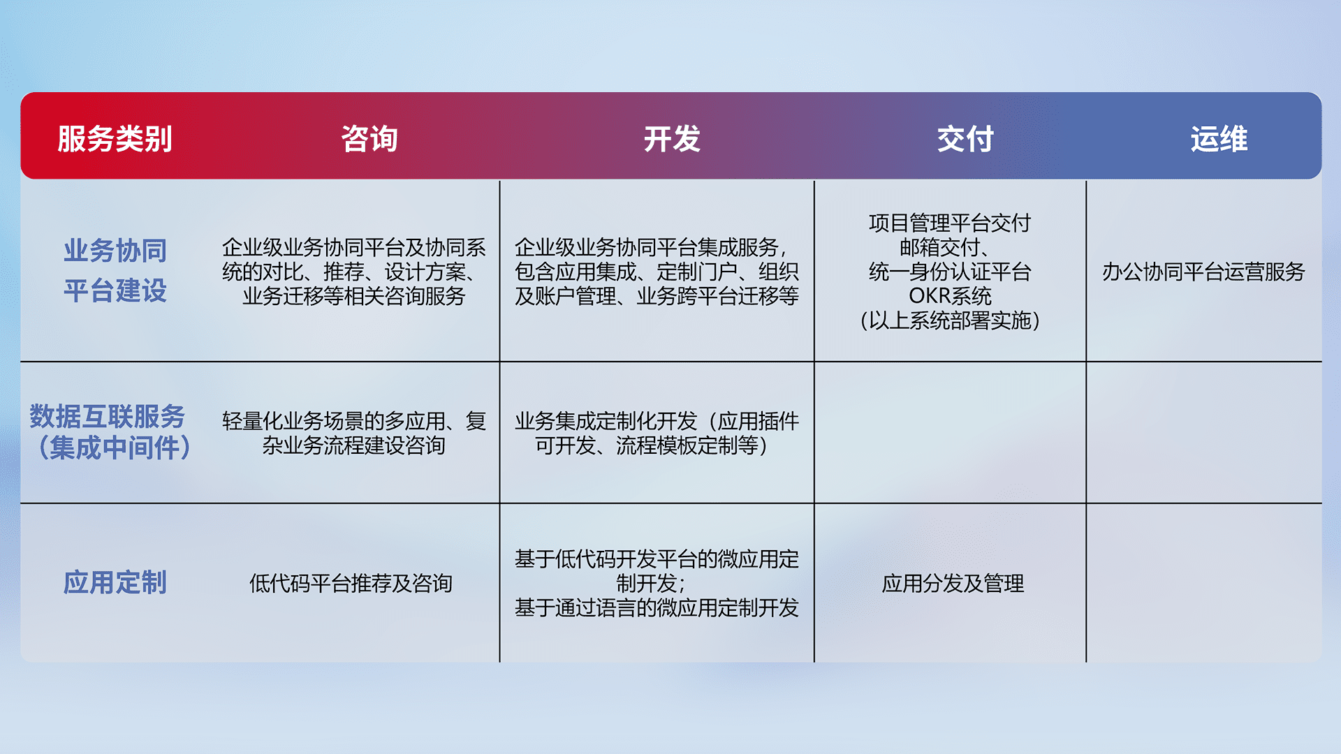 针对钉钉、、、企微、、、、IDaas等平台级产品提供产品的规划、、、、方案、、、交付、、、定制化开发等服务,,,,实现如统一协同办公、、、智能客户服务、、混合会议管理、、、、智能数据查询、、、、等业务场景,,实现数字化转型。。